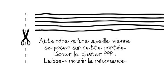 La matérialité diffuse du son et la réception « courtoise » qu’elle suppose, nous permet d’envisager une posture compositionnelle différente, qui ne peut pas se satisfaire de manipulations conceptuelles de type « harmoniquo-mathématiques » a priori, mais plutôt de manipulations qui mettent en jeu le corps entier. Manipulations que je qualifierai de « plastiques », « bricolages décontractés » autour de la matérialité sonore qui se répand et dont le relevé des gestes reste à écrire. En effet, l’efficacité chinoise nous propose d’envisager, d’une part une forme d’écriture « circonstancielle » qui consiste à proposer une situation expansive (site et moment), et d’autre part une forme « circonstanciée » qui est une réponse objective à l’émission d’un son expansif sur le motif. L’objet sonore fade est à un niveau substantiel polyvalent qui semble nécessiter une certaine « gymnastique » de la part du compositeur ou de l’interprète, où les notions de modifications qualitatives et quantitatives se trouvent remplacées par les notions plastiques désormais opérantes dans le domaine de la musique de perturbation, confrontation, brouillage, hésitation, dissimulation…